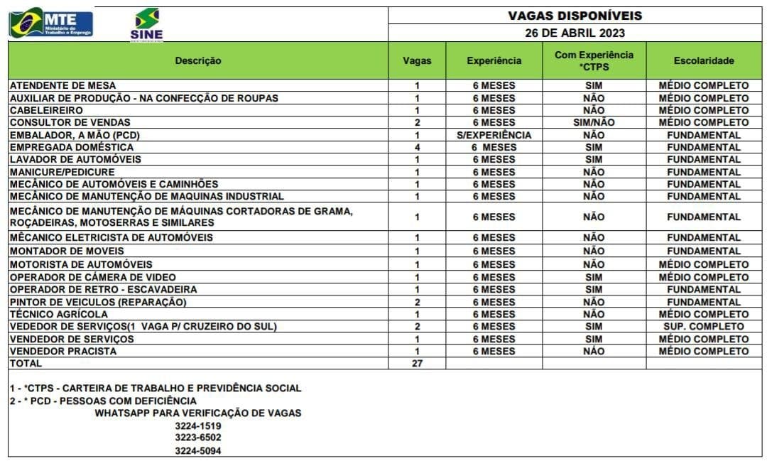 Para quem já possui cadastro e tem interesse em umas das vagas, podem entrar em contato por meio do WhatsApp nos números: (68) 3223-6502; (68) 3224-5094; (68) 3224-1519 ou 0800 647-8182.