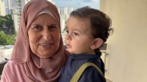 “Habibi! Habibi!” Em um apartamento da zona sul de São Paulo (SP), Nawal Abujayyab, de 61 anos, abraça o neto…