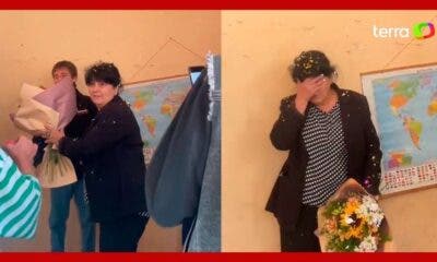 Uma professora levou um tremendo susto ao entrar na sala de aula e se deparar com o que parecia uma briga. A mulher fica visivelmente preocupada...