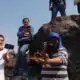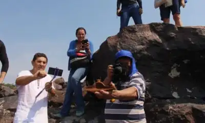 As gravuras milenares representando rostos, animais e elementos da natureza amazônica incrustadas na superfície do pedral e nas rochas submersas do sítio arqueológico Ponta das Lajes...