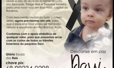 A família de Davi Reis, dois anos, pede ajuda para fazer o translado do corpo do pequeno para ser sepultado no Acre. A criança faleceu vítima...