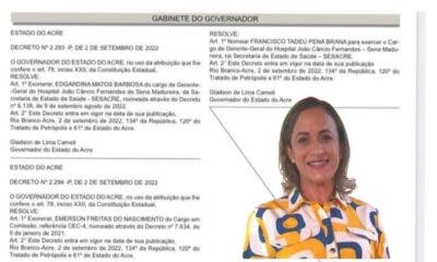 O governo do Estado publicou no Diário Oficial, desta terça-feira, 6, a exoneração da gerente-geral do Hospital João Câncio Fernandes, de Sena Madureira (AC), Edigardina Matos....