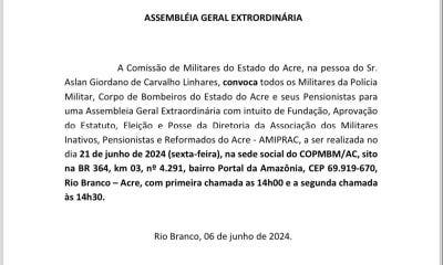 ASSEMBLÉIA GERAL EXTRAORDINÁRIA A Comissão de Militares do Estado do Acre, na pessoa do Sr. Aslan Giordano de Carvalho Linhares, convoca todos os Militares da Polícia...