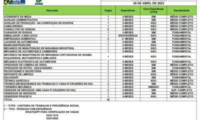 O Sistema Nacional de Emprego do Acre (Sine) está ofertando 35 vagas de emprego para esta quinta-feira,20. Dessas, 14 são para quem possui nível fundamental, 19...