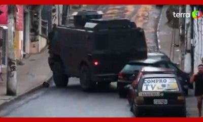 Um caveirão deslizou e bateu em veículos estacionados em uma tentativa de subir uma ladeira durante operação no Complexo do Alemão, no Rio de Janeiro, nesta...