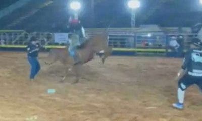 Um locutor foi pisoteado por um touro durante a narração do rodeio amador que abria a festa do Primeiro Encontro de Cowboys, em Paranaíba, município a...