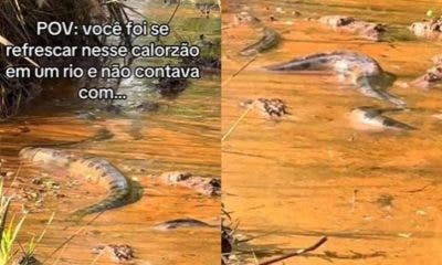 Uma mulher foi surpreendida ao tentar se refrescar no Rio Turvo, em Goiás. No local, ela flagrou uma sucuri gigante nadando nas águas. Luana Santos publicou...