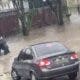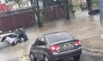 Um motorista com a ajuda de outras pessoas tenta ‘salvar’ seu carro após ficar submerso em rua alagada durante a chuva intensa que caiu neste sábado...