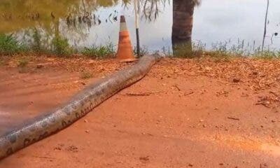 Um biólogo fez um vídeo do momento exato em que uma sucuri-verde entra em um lago na cidade de Porteirão, em Goiás. De acordo com Deucí...