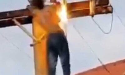 Um homem, aparentemente alcoolizado, tomou um choque e caiu de uma altura de cerca de cinco metros após subir em um poste de energia e tentar...