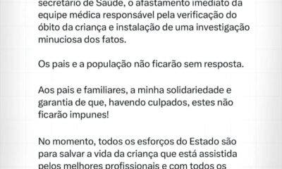 O governador do Acre, Gladson Cameli (Progressistas), anunciou neste sábado, 25, o afastamento imediato da equipe médica responsável pela declaração de óbito de um recém-nascido, que...