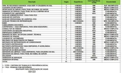 O Sistema Nacional de Emprego do Acre (Sine), está ofertando 52 vagas de emprego para esta quinta-feira, 24. Dessas, 31 são para quem possui nível fundamental,...