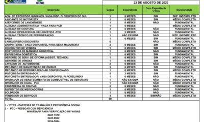 O Sistema Nacional de Emprego do Acre (Sine), está ofertando 50 vagas de emprego para esta quarta-feira, 23. Dessas, 30 são para quem possui nível fundamental,...