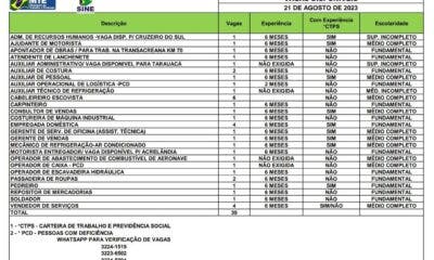 O Sistema Nacional de Emprego do Acre (Sine) está ofertando 39 vagas de emprego para esta segunda-feira, 21. Dessas, 18 são para quem possui nível fundamental,...