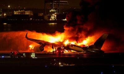 Imagens divulgadas pela emissora pública NHK mostram o momento exato em que chamas saem das janelas da aeronave da Japan Airlines (JAL) Airbus A350 ao derrapar na...