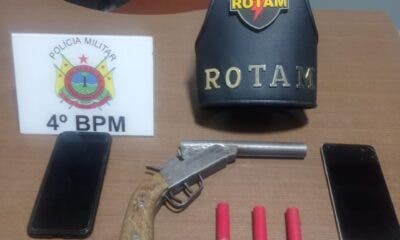 Militares do 4° Batalhão PM e da companhia de Rondas ostensivas tático móvel (ROTAM), da Polícia Militar apreenderam uma arma de fogo e prenderam dois envolvidos,...