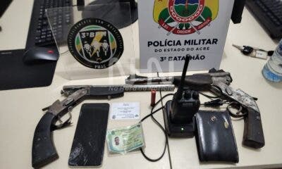 Policiais militares do Rádio Patrulhamento Motorizado (RPM) apreenderam armas e um rádio comunicador no bairro Caladinho, em Rio Branco, na tarde da última quarta-feira, 13, durante...