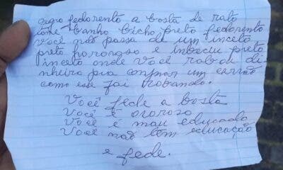 Alan Batista, empreendedor de 33 anos, encontrou um bilhete com ofensas racistas, no último domingo (1/10), em São Gonçalo do Amarante, na Grande Natal. Ele estava saindo...