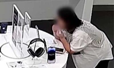 Uma mulher usou os próprios dentes para roer um cabo de segurança que prendia um celular modelo iPhone 14 Plus ao balcão de uma loja na...