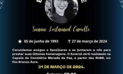 O estado do Acre se despede de Suanne Camelo, uma jovem de 30 anos que perdeu a vida em um trágico acidente aéreo que ocorreu no...