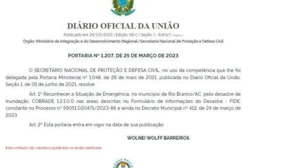 O governo do Acre, por meio da Defesa Civil Estadual, informa que às 6h deste domingo, 26, o nível de medição do Rio Acre, em Rio...