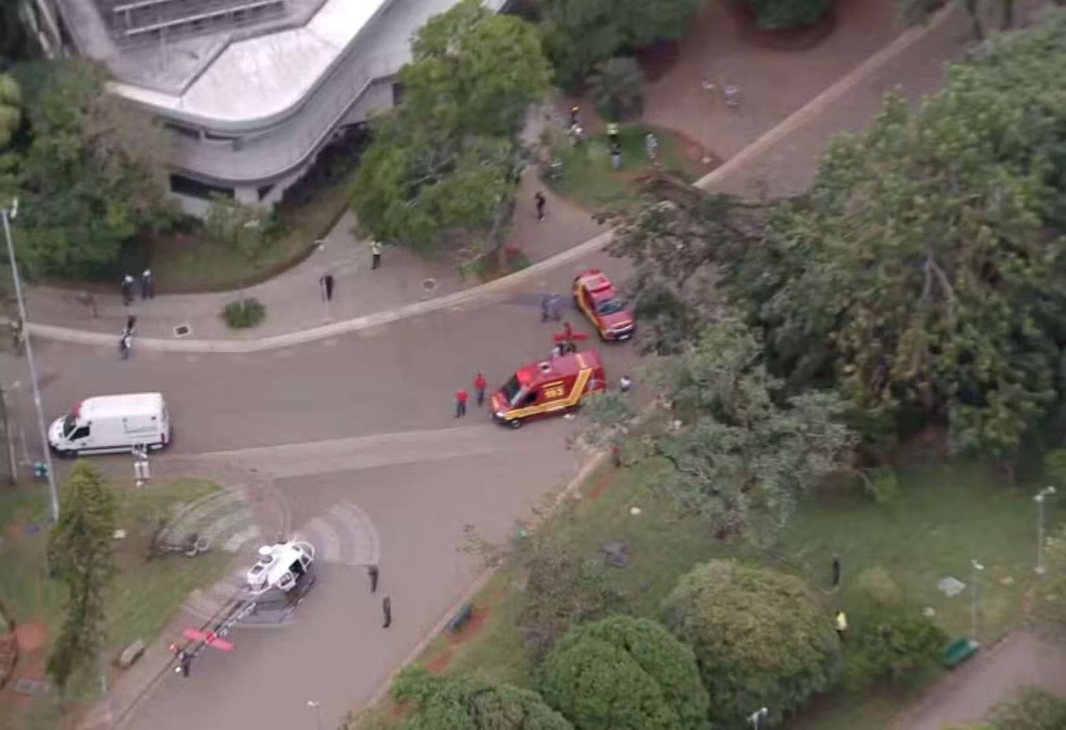 Imagens obtidas pelo helicóptero da TV Globo mostram a árvore caída próxima ao Portão 3 do Parque Ibirapuera, na altura da Avenida Pedro Álvares Cabral.