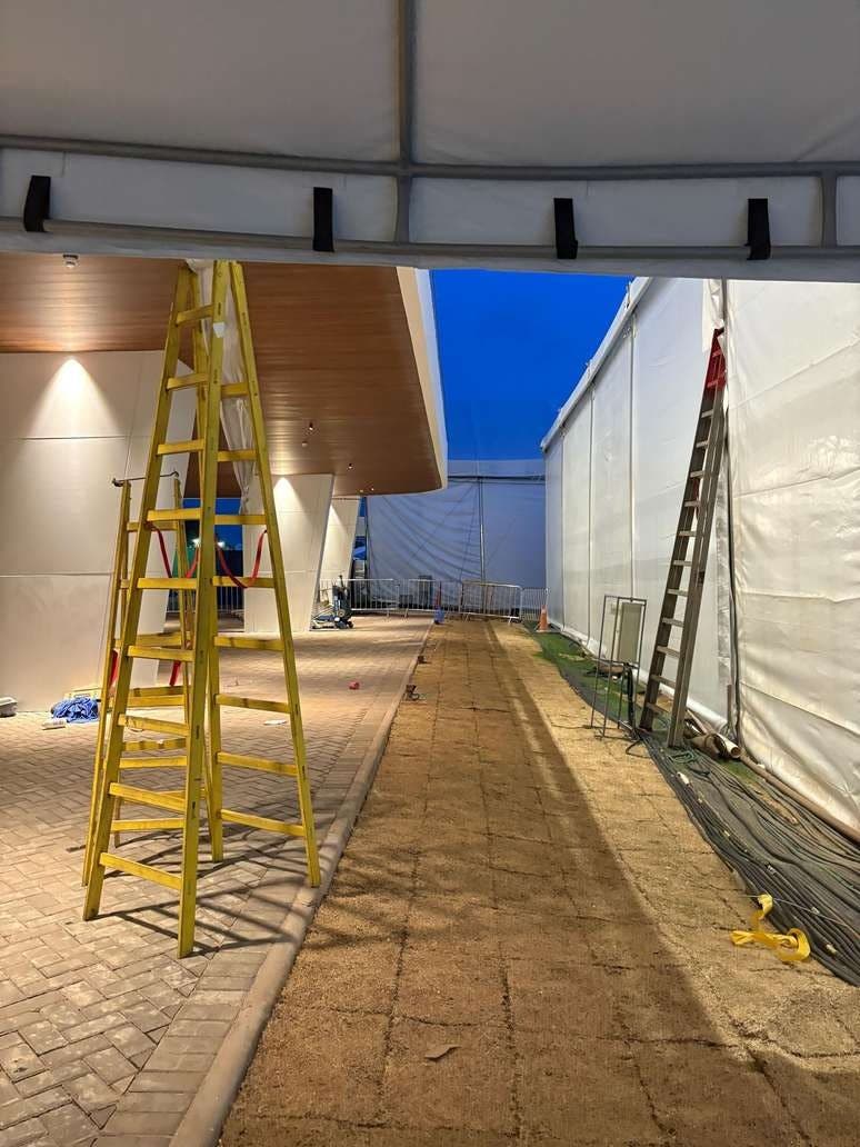 Ao seguir andando, a vista foi de pavilhões incompletos, com tapumes e obras em andamento. Em diversos pontos também foi possível notar escadas, extintores, galões de água e outros itens que destoaram de um ambiente pensado para estar preparado para receber lideranças globais.