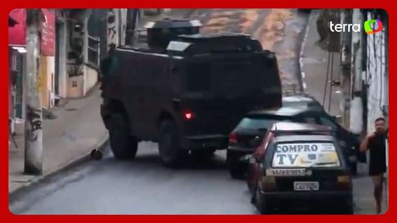 Um caveirão deslizou e bateu em veículos estacionados em uma tentativa de subir uma ladeira durante operação no Complexo do Alemão, no Rio de Janeiro, nesta quarta-feira, 15. No registro das colisões, é possível ver três carros e uma moto atingidos pelo blindado.