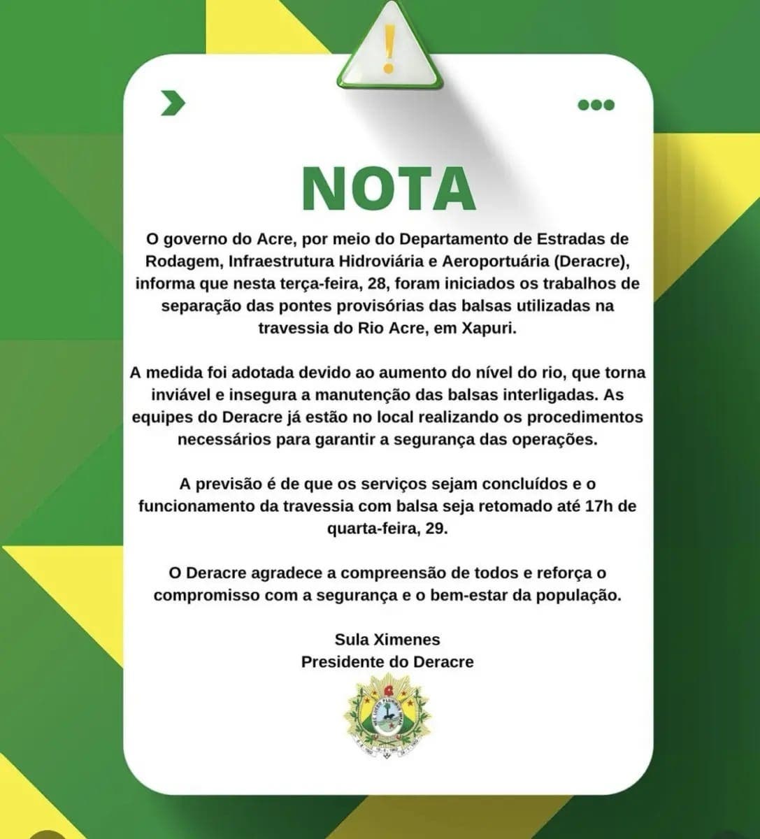A presidente do Deracre, Sula Ximenes, assina a nota informativa sobre a ação.