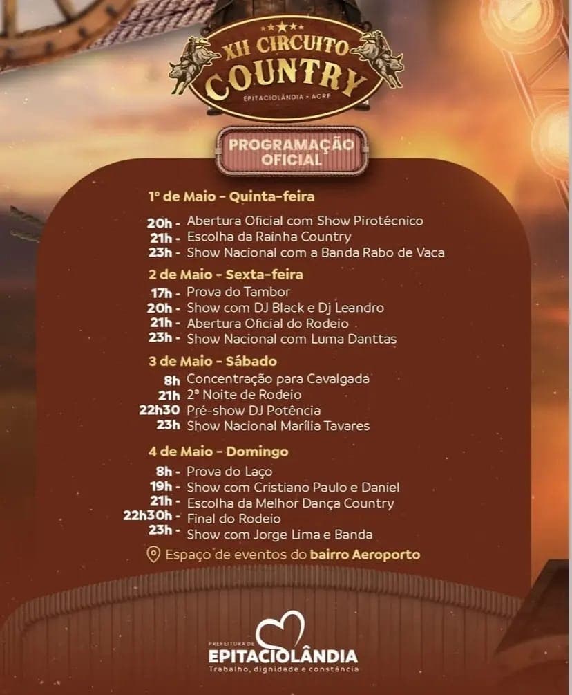 Epitaciolândia entra em ritmo de festa! De 1º a 4 de maio, o município celebra seus 33 anos de emancipação política com o 12º Circuito Country, um evento que promete agitar a região com shows nacionais, atrações locais e atividades tradicionais da cultura country. A expectativa é de um grande público, com visitantes de cidades vizinhas e até mesmo do exterior.