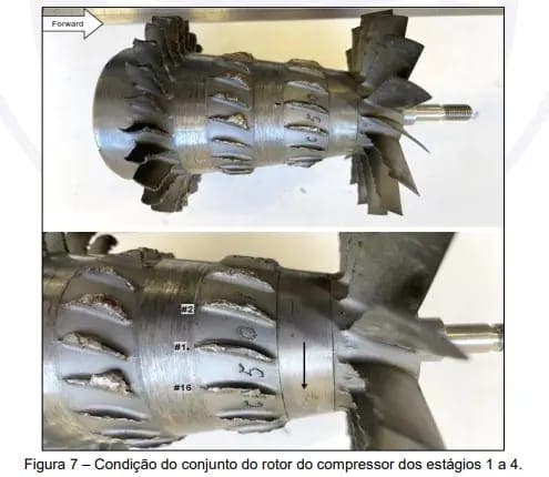 Os peritos identificaram que a perda de potência esteve ligada ao rompimento de uma palheta do segundo estágio do compressor do motor. Exames laboratoriais, como microscopia eletrônica de varredura e análises químicas, revelaram que a fratura teve origem em pontos de corrosão, com desenvolvimento de fadiga em múltiplas áreas. A separação da peça provocou o desprendimento de outras pás nos estágios subsequentes, gerando danos internos significativos ao motor.