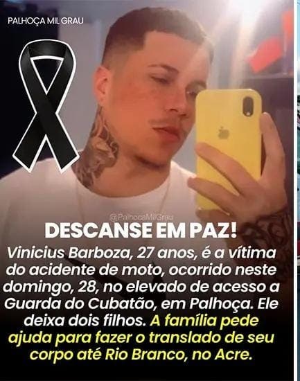 Palhoça, SC – Um acidente de motocicleta ceifou a vida de Vinicius Barboza, de 27 anos, na tarde deste domingo (28), no elevado de acesso à Guarda do Cubatão, em Palhoça, Santa Catarina. O jovem, natural de Rio Branco, Acre, não resistiu aos ferimentos e faleceu no local do acidente, deixando dois filhos.