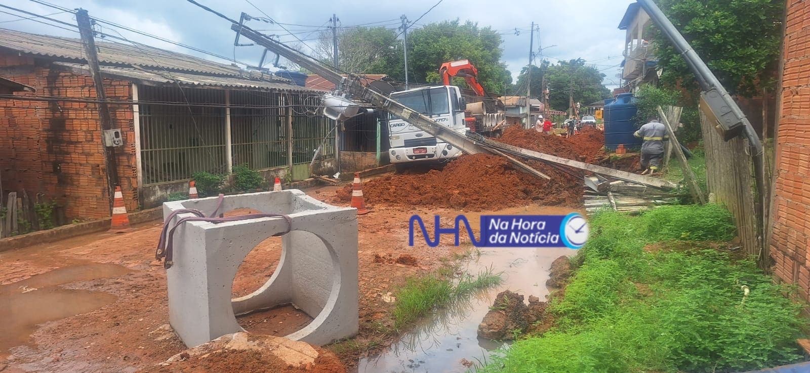 Equipes da prefeitura do município estavam cavando um buraco na lateral da rua para instalar uma caixa de concreto e ligar os bueiros, porém, um poste que estava próximo acabou tomando durante a realização do serviço.