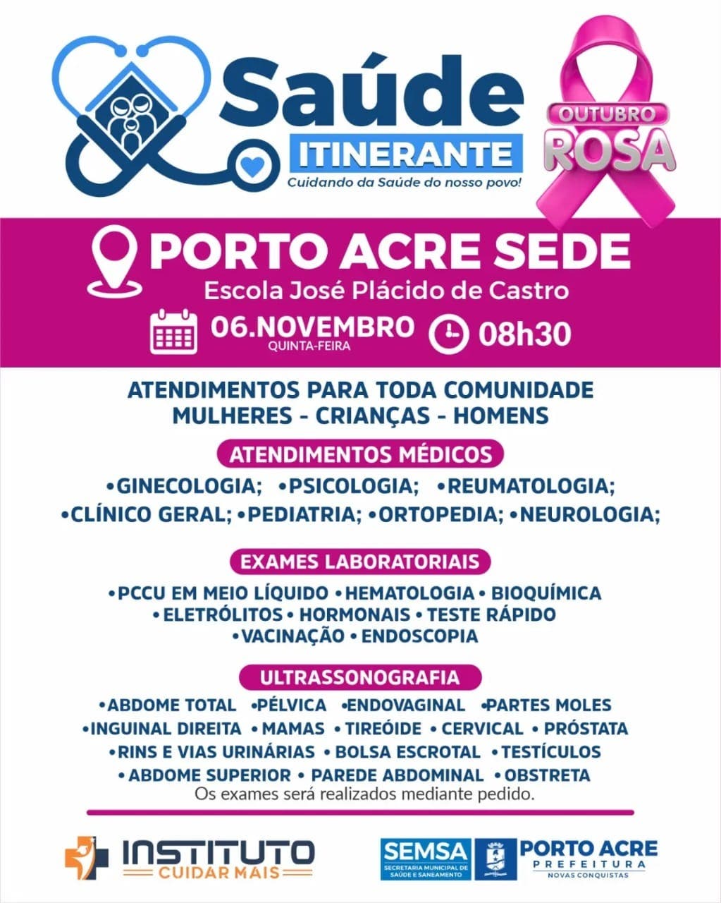 A população de Porto Acre terá acesso facilitado a serviços de saúde nesta quinta-feira, 6, com a chegada do programa Saúde Itinerante. A iniciativa, promovida pela Prefeitura de Porto Acre, por meio da Secretaria Municipal de Saúde (Semsa), em parceria com o Instituto Cuidar Mais, oferecerá consultas médicas, exames laboratoriais e ultrassonografias na Escola José Plácido de Castro, a partir das 8h30.