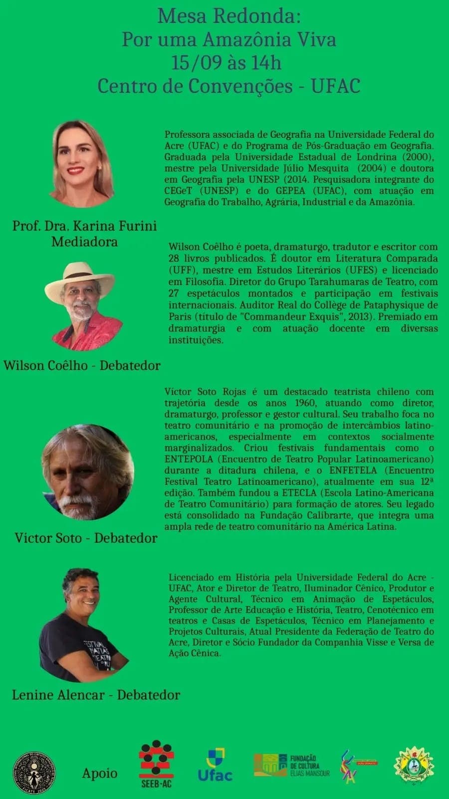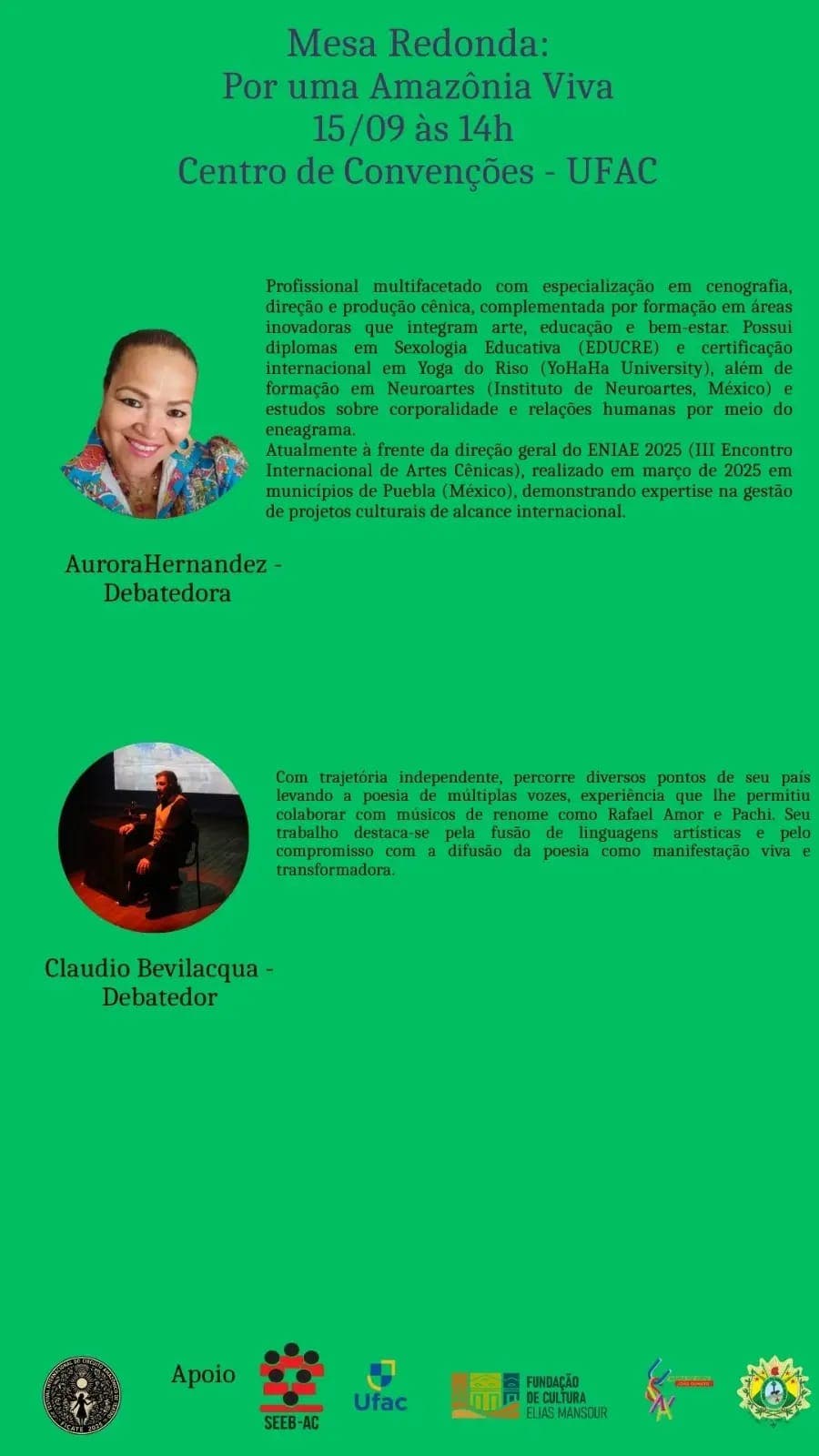 A abertura oficial será marcada por uma mesa-redonda imperdível no dia 15, às 14h, no Centro de Convenções da Ufac. Com o tema provocador “Por uma Amazônia Viva”, o debate reunirá artistas, pesquisadores e pensadores para uma reflexão profunda sobre a intersecção entre arte, sociedade e meio ambiente na Amazônia contemporânea.