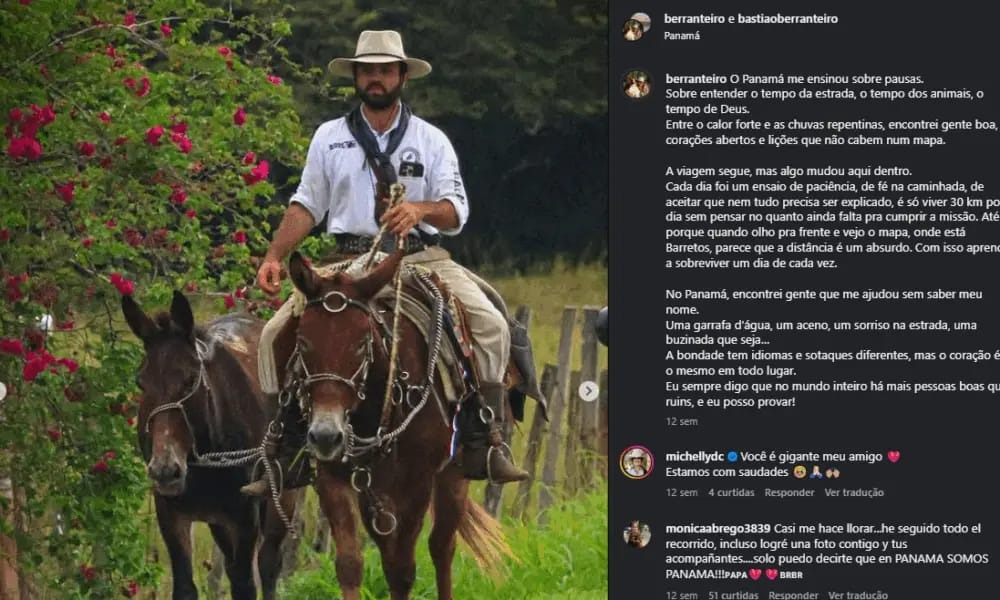 Apesar do imprevisto com as mulas, o viajante mantém o objetivo de retomar a jornada com os animais assim que estiver em território brasileiro. O plano é reencontrar Ada e Oklahoma para dar continuidade à trajetória, mantendo viva a proposta de valorizar práticas e modos de vida ligados ao campo.