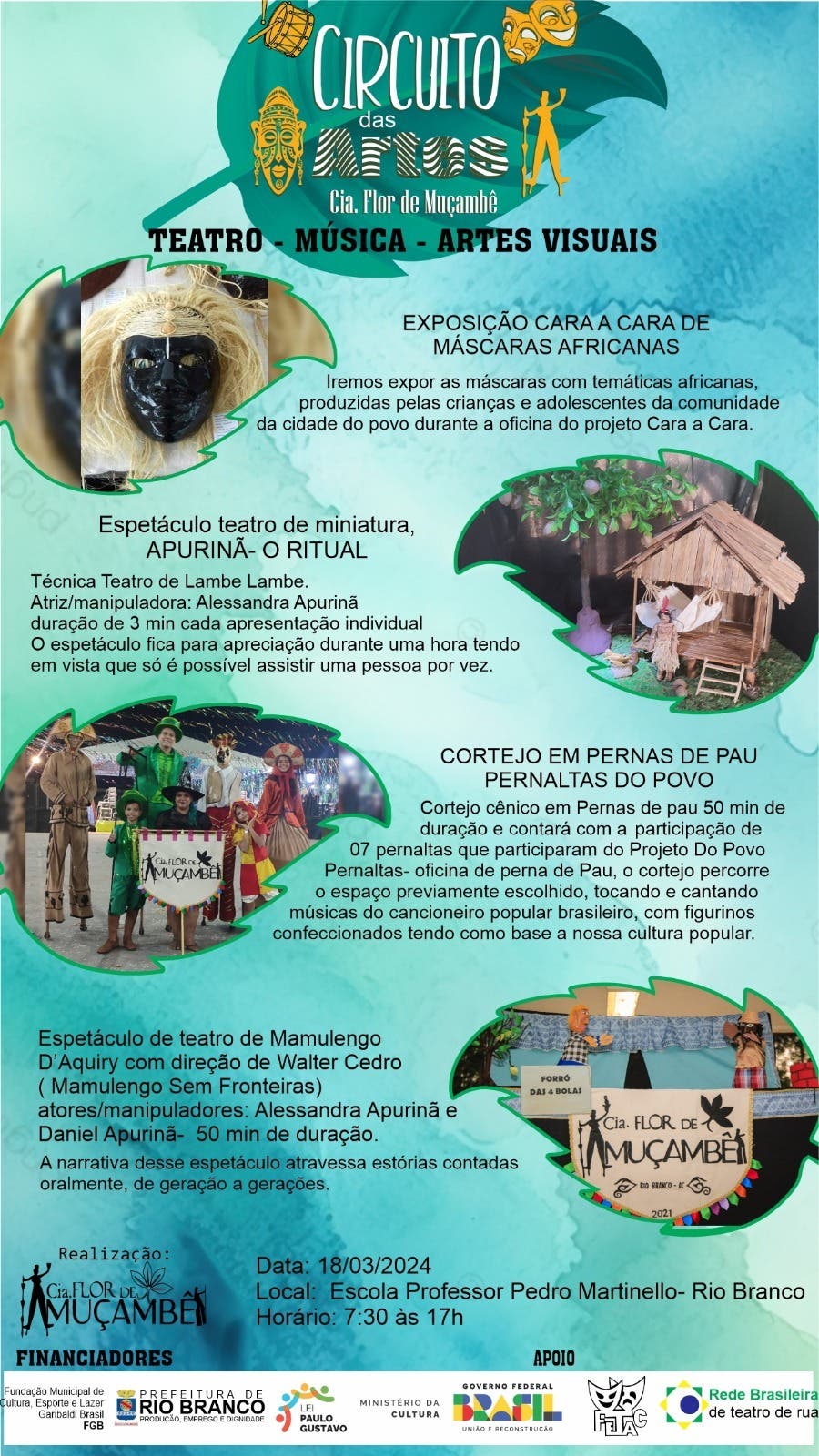 A Cia Flor de Muçambê realizará, entre os dias 11 e 22 de março, em Rio Branco, Senador Guiomard e Boca do Acre, o projeto Circuito das Artes. A ação é financiada pela Fundação Garibaldi Brasil, por meio da Lei Paulo Gustavo.