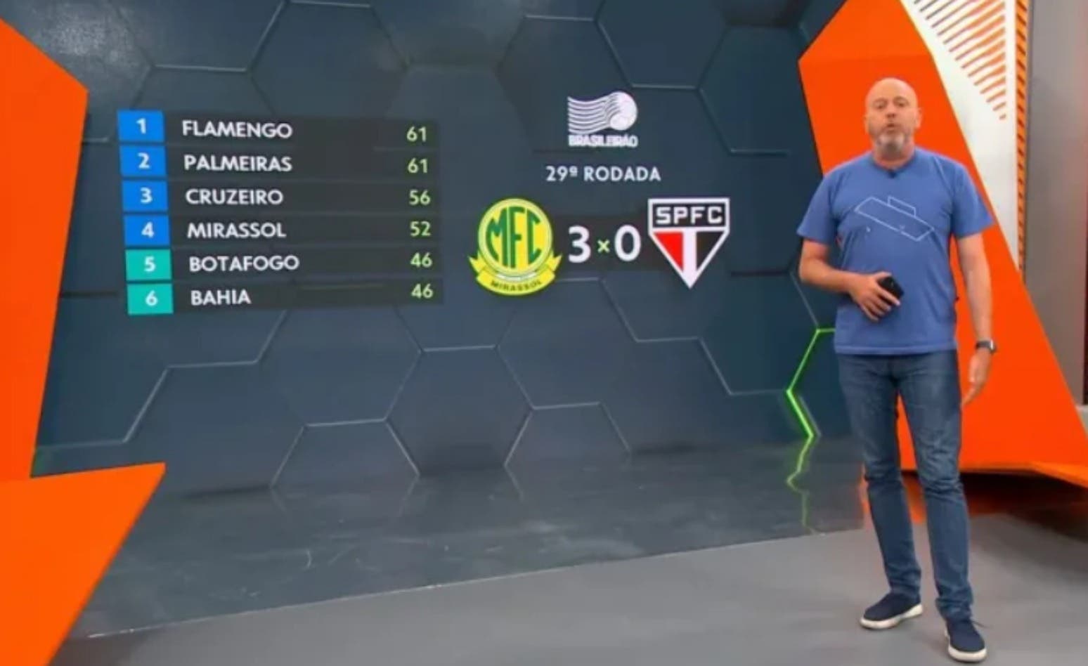 O comentário ironiza o fato de que em São Paulo, no programa apresentado por Fred Bruno, a classificação foi exibida de maneira correta, com o Palmeiras na liderança da tabela. Até o momento, a emissora carioca não se manifestou sobre o ocorrido.