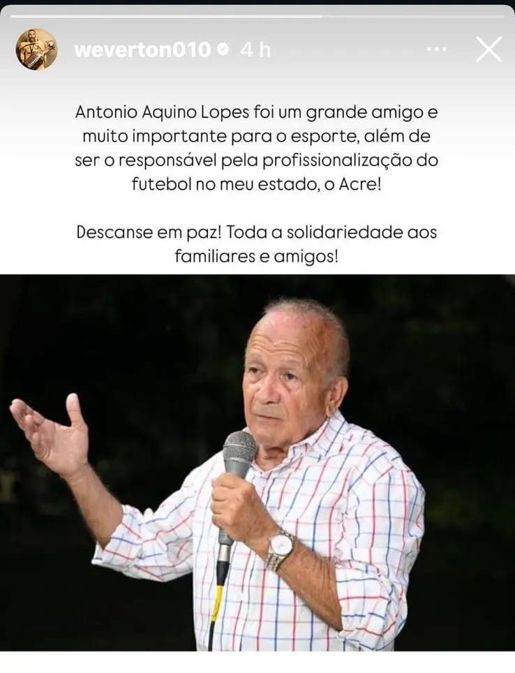 O goleiro acreano Weverton Pereira, do Palmeiras e da Seleção Brasileira, usou as redes sociais para lamentar a morte de Antônio Aquino Lopes, presidente da Federação de Futebol do Acre (FFAC), ocorrida na quarta-feira (16). Em sua publicação, Weverton destacou a importância de Aquino para o desenvolvimento do futebol acreano e sua amizade pessoal com o dirigente.