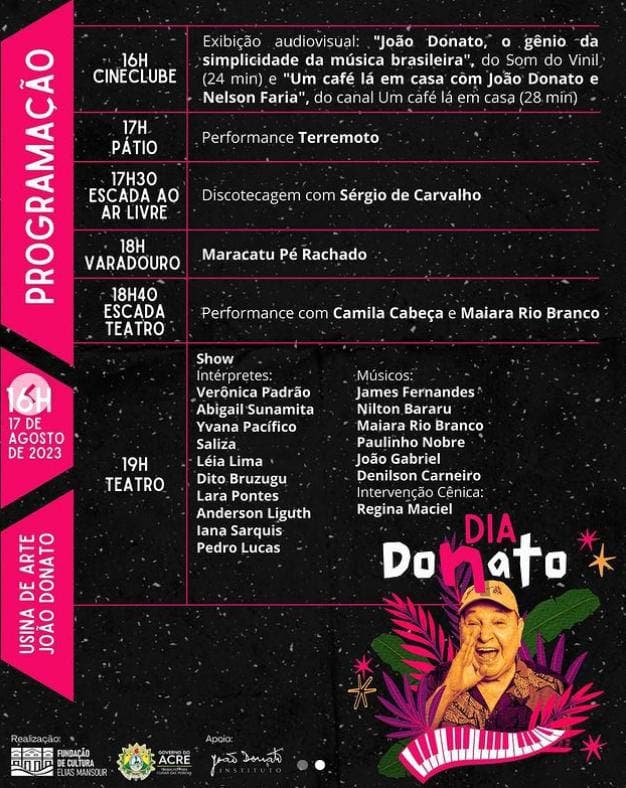 A programação do evento incluirá uma variedade de atrações que honram a carreira e o talento de João Donato. Desde uma sessão de vídeos que traça sua trajetória musical até um empolgante show com artistas interpretando suas canções icônicas, os participantes serão imersos em uma experiência única, onde a música se funde com as emoções de todo público de várias gerações.