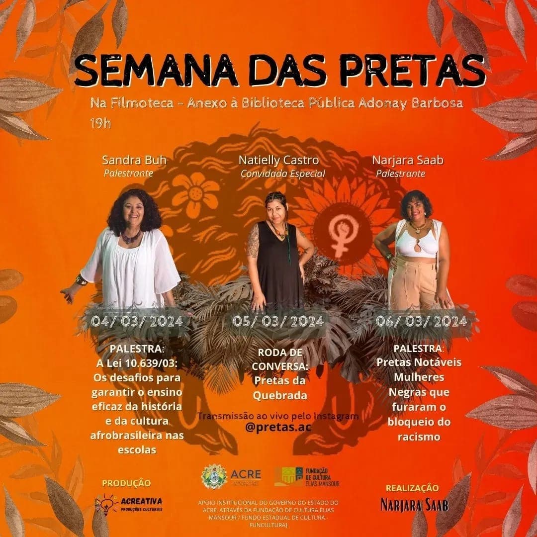 A capital acreana contará entre os dias 4 e 8 de março com o projeto “Semana das Pretas”. A ação será realizada na Filmoteca (anexo à Biblioteca da Adonay Barbosa) e na Usina de Arte João Donato.