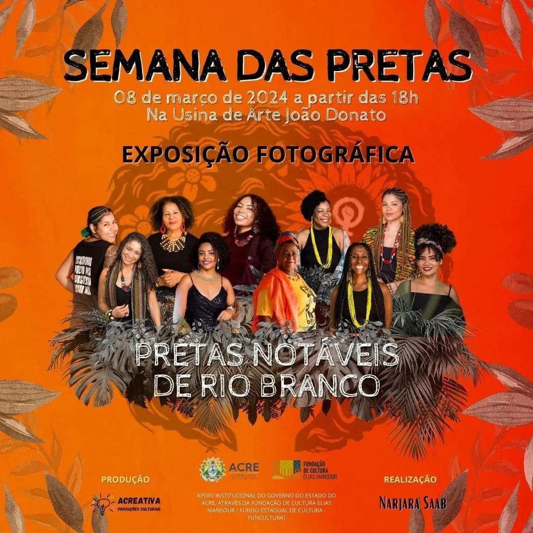 Dia 08/03/24, às 18h, na Usina de Arte João Donato: EXPOSIÇÃO FOTOGRÁFICA: Pretas Notáveis de Rio Branco – Por Narjara Saab*, que reúne o registro de 10 mulheres negras residentes e atuantes na cidade de Rio Branco/AC e que atuam em profissões e atividades onde não há uma significante representatividade da população negra.