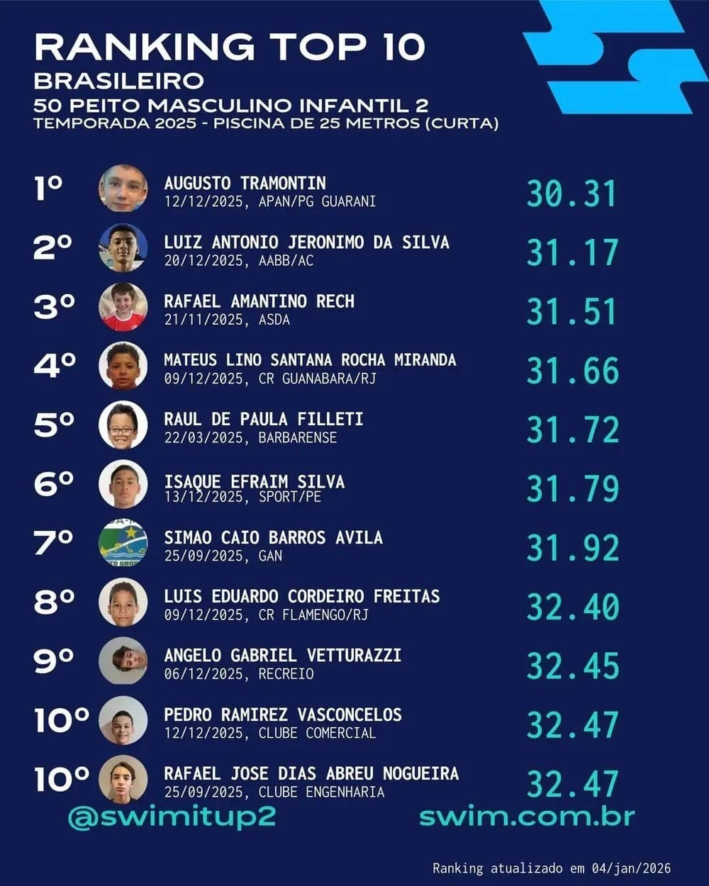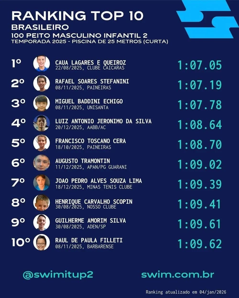RIO BRANCO (AC) – 10 de janeiro de 2026 – A natação acreana encerrou o ano de 2025 com um feito histórico: atletas do estado figuram entre os dez melhores do país em provas de piscina curta e longa, conforme divulgado pelo Swim It Up!, plataforma especializada em estatísticas e rankings da modalidade no Brasil. O desempenho vem acompanhado de quebras de recordes estaduais e resultados expressivos em competições nacionais.