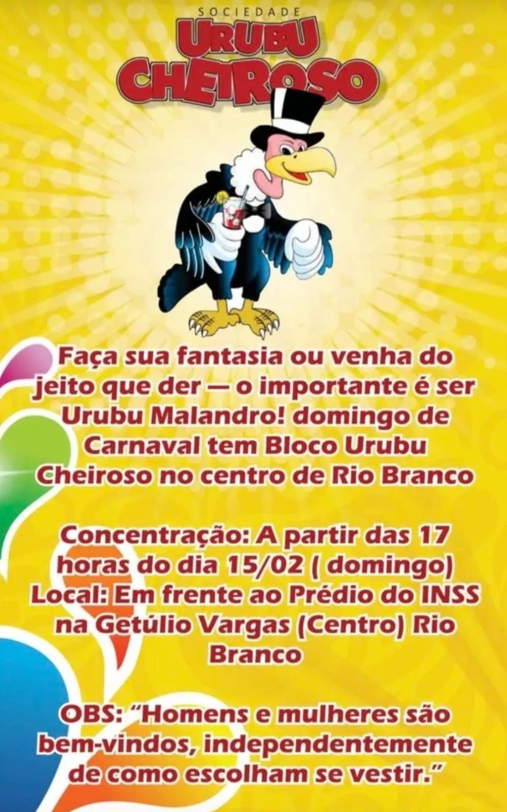RIO BRANCO (AC) – Um dos blocos mais queridos da capital acreana retorna às ruas neste domingo (15): o Urubu Cheiroso promete animar o Centro de Rio Branco com sua mistura de tradição e descontração, fazendo parte da programação oficial do Carnaval de 2026. A concentração está marcada para as 17h, em frente ao prédio do INSS, na Avenida Getúlio Vargas.
