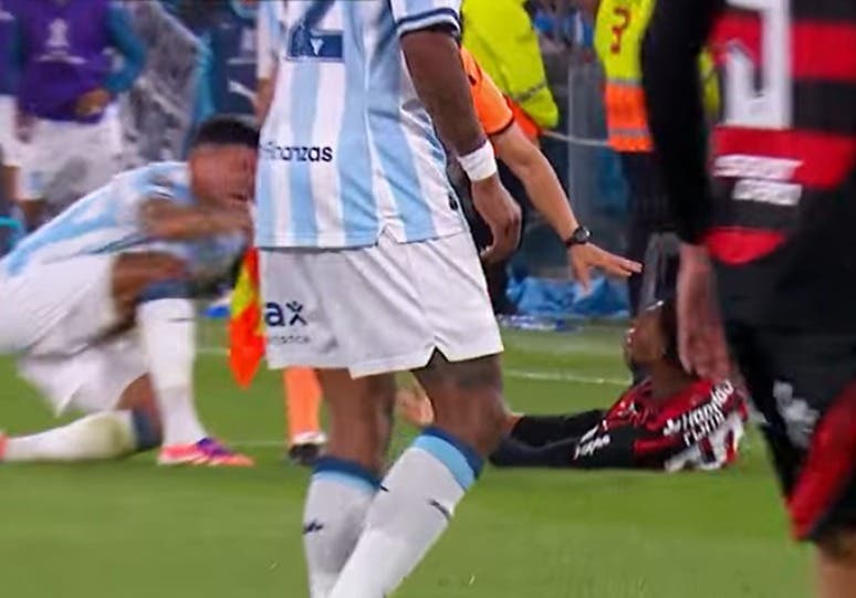“O jogador do Racing tenta levantar o do Flamengo pela camisa. E o jogador do Flamengo lhe dá um golpe, com o punho, nas genitais”, diz Urrutia.
