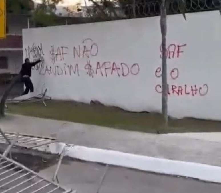 Os torcedores ainda picharam a frase “Flamengo é do povão” no muro do CT. Horas depois do ocorrido, funcionários do clube retiraram as pichações.
