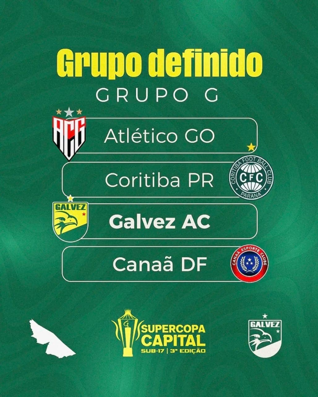 O Galvez Atlético Clube tem a honra de representar o estado do Acre na 3ª edição da Super Copa Capital Sub-17, uma prestigiada competição de base que acontecerá de 1º a 14 de dezembro de 2025, no Distrito Federal. O clube acreano integrará o Grupo G, ao lado de grandes equipes como Atlético Goianiense, Coritiba e Canaã-DF.