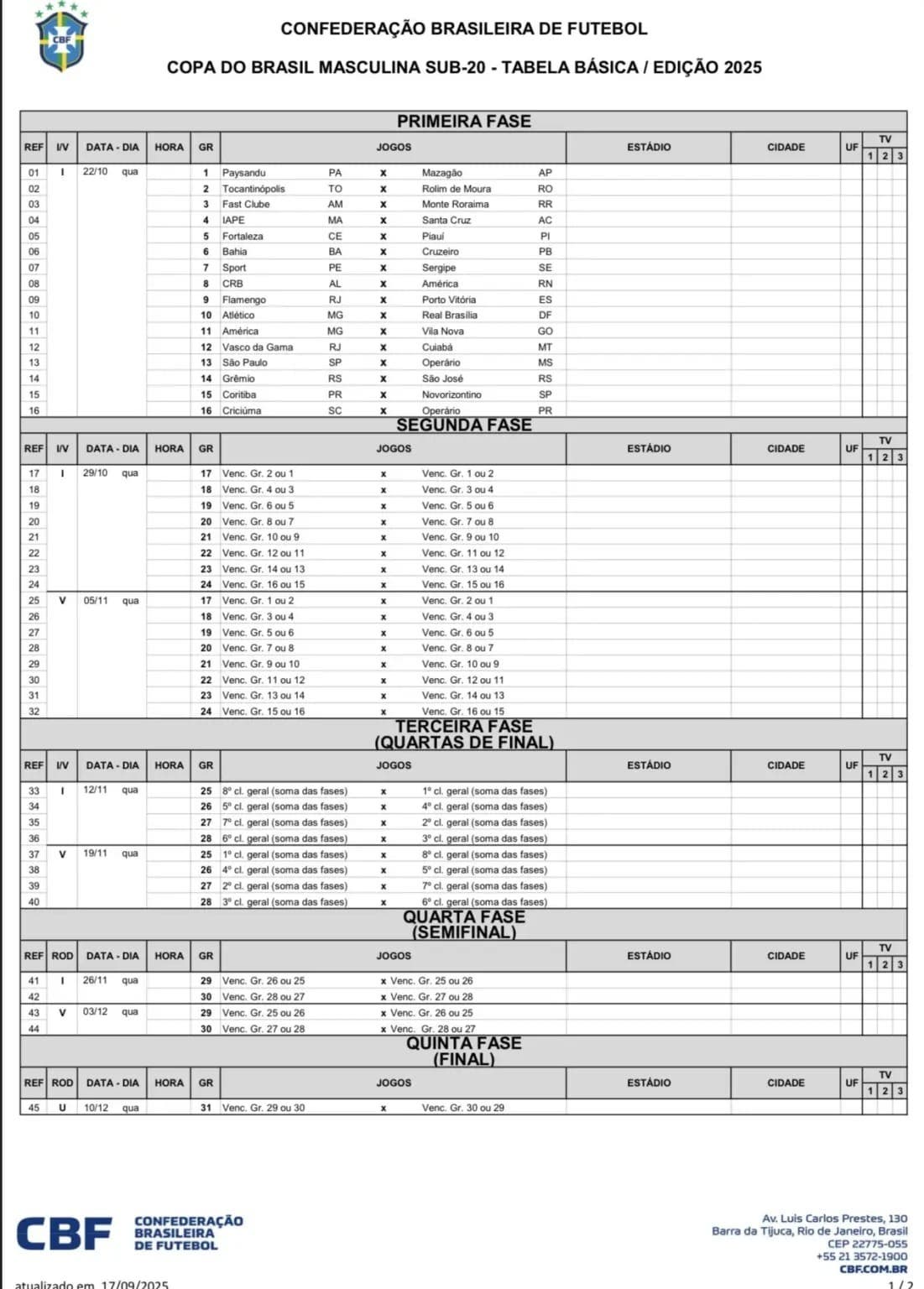 Rio Branco, AC – O Santa Cruz-AC já tem seu primeiro adversário definido na busca pelo título da Copa do Brasil Sub-20: o Iape-MA. A Confederação Brasileira de Futebol (CBF) divulgou a tabela oficial da competição na última quarta-feira (17), revelando o confronto que promete agitar o cenário do futebol de base nacional.