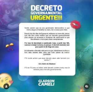 O governador Gladson Cameli publicou um ‘decreto’ urgente em suas redes sociais, na tarde deste domingo, 6. Na postagem, o…