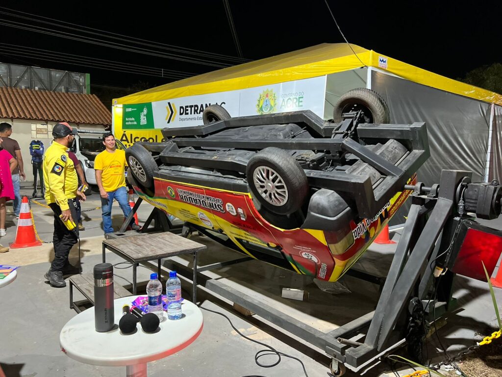 O Departamento de Trânsito (Detran) disponibilizou um simulador de capotamento logo no portão principal do Parque de Exposições Wildy Viana, onde acontece a Expoacre 2023.